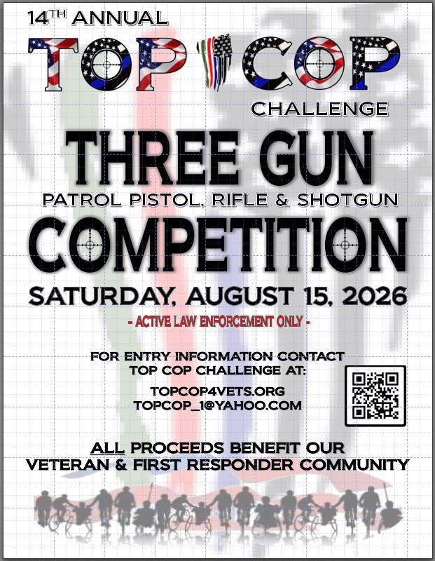Top Cop 2026 is again a 3 gun challenge using your duty pistol, patrol rifle and shotgun, and yes, we’ve again added new steel to this year’s competition, so if you thought 2025 was a challenge, wait for this year. Reminder: If you do not have a patrol rifle and/or shotgun, we will provide an AR style rifle and/or a Remington 870 shotgun or equivalent for you.